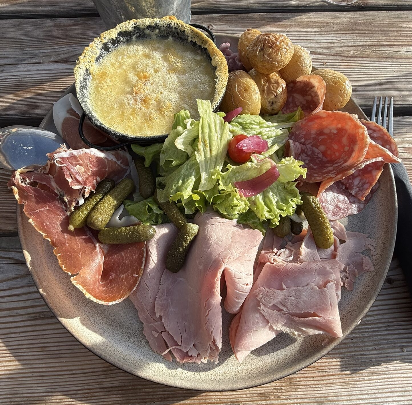 Assiette de spécialités montagnardes servie à La Grange, restaurant d’altitude sur les pistes de l’Alpe d’Huez.